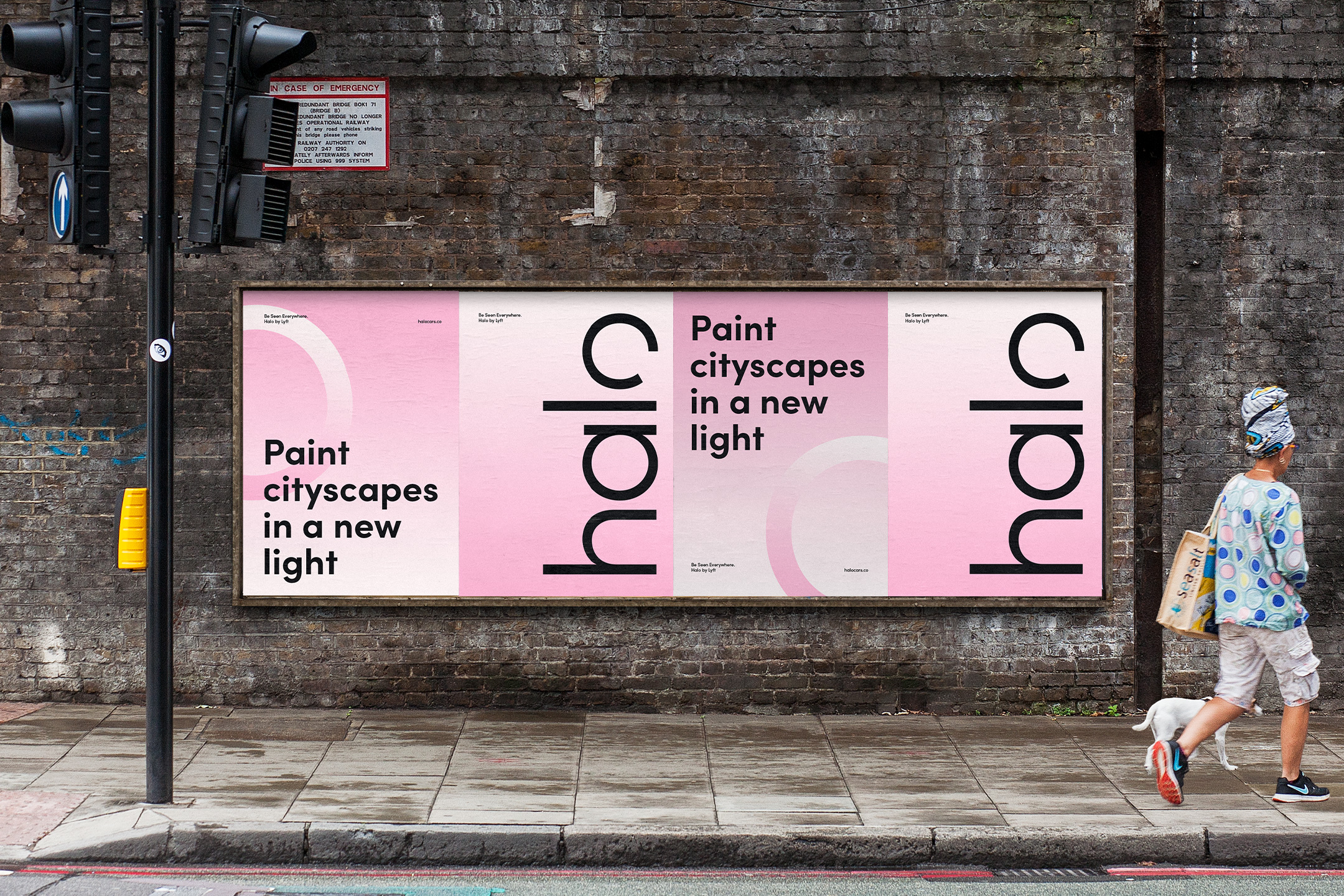 With Boulder-based agency Human Design, we worked with the Lyft team to construct a spirited visual language to light up the night. The outcome was restrained, championing the simplicity of black and white, with a jolt of bubblegum pink. The bespoke logotype emerged from the Lyft brand typeface, representing movement and closed-circuit connectedness. We sought tension in the identity system, developing a look that flexed corporate muscles during the day, and shut the dance floor down at night. The tone and messaging piggybacked off of the Lyft personality — with wit an humor. In 2022, Halo was brought under the Lyft Media umbrella, where it was folded into the core visual identity of Lyft.
