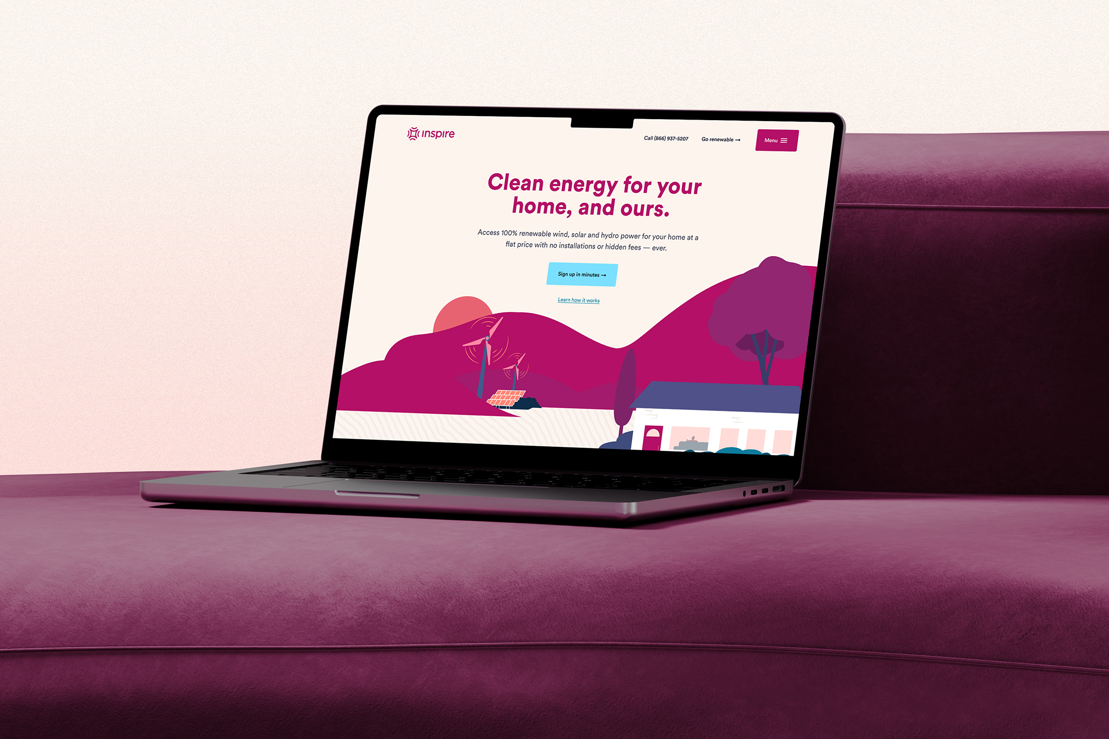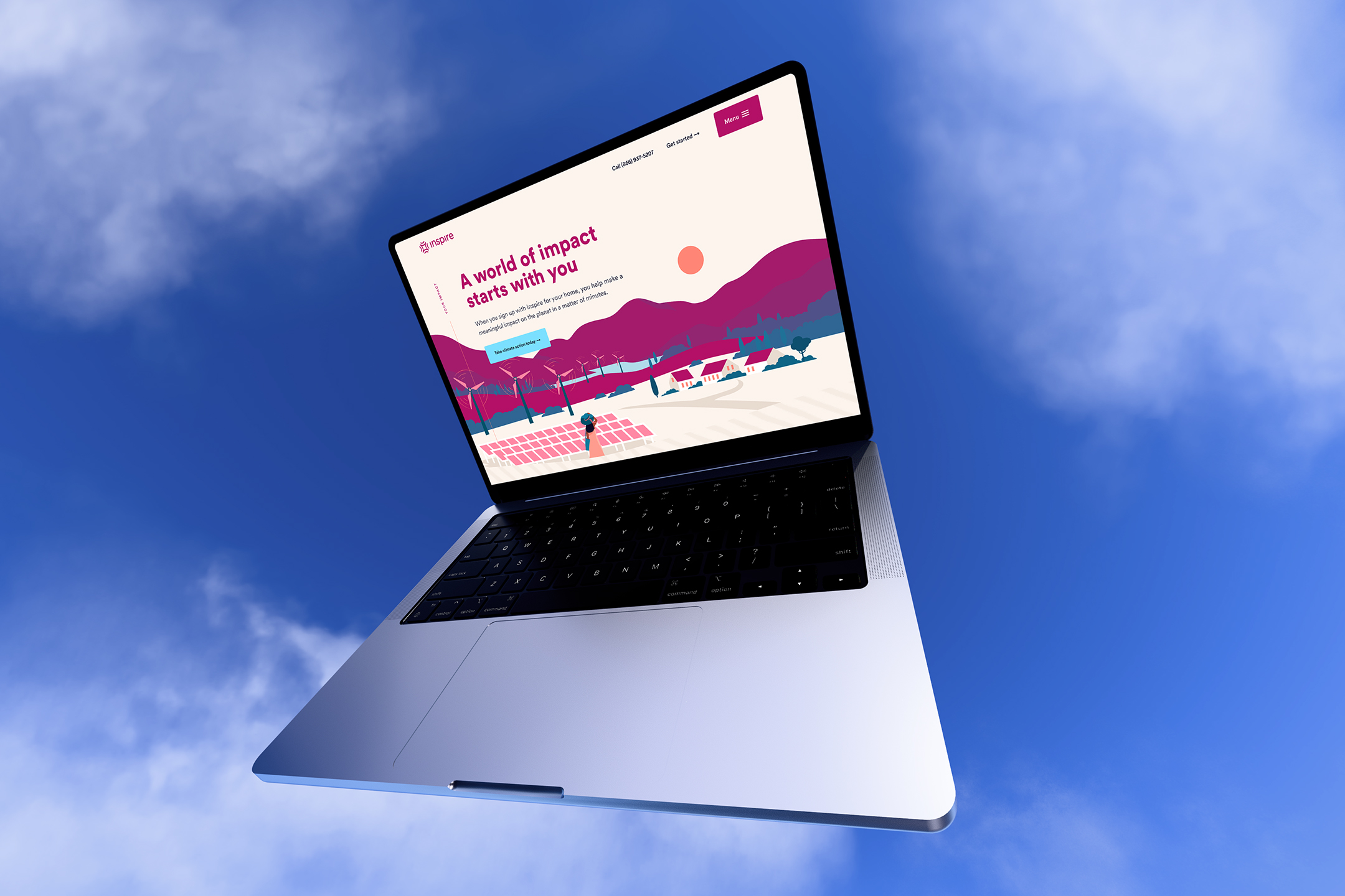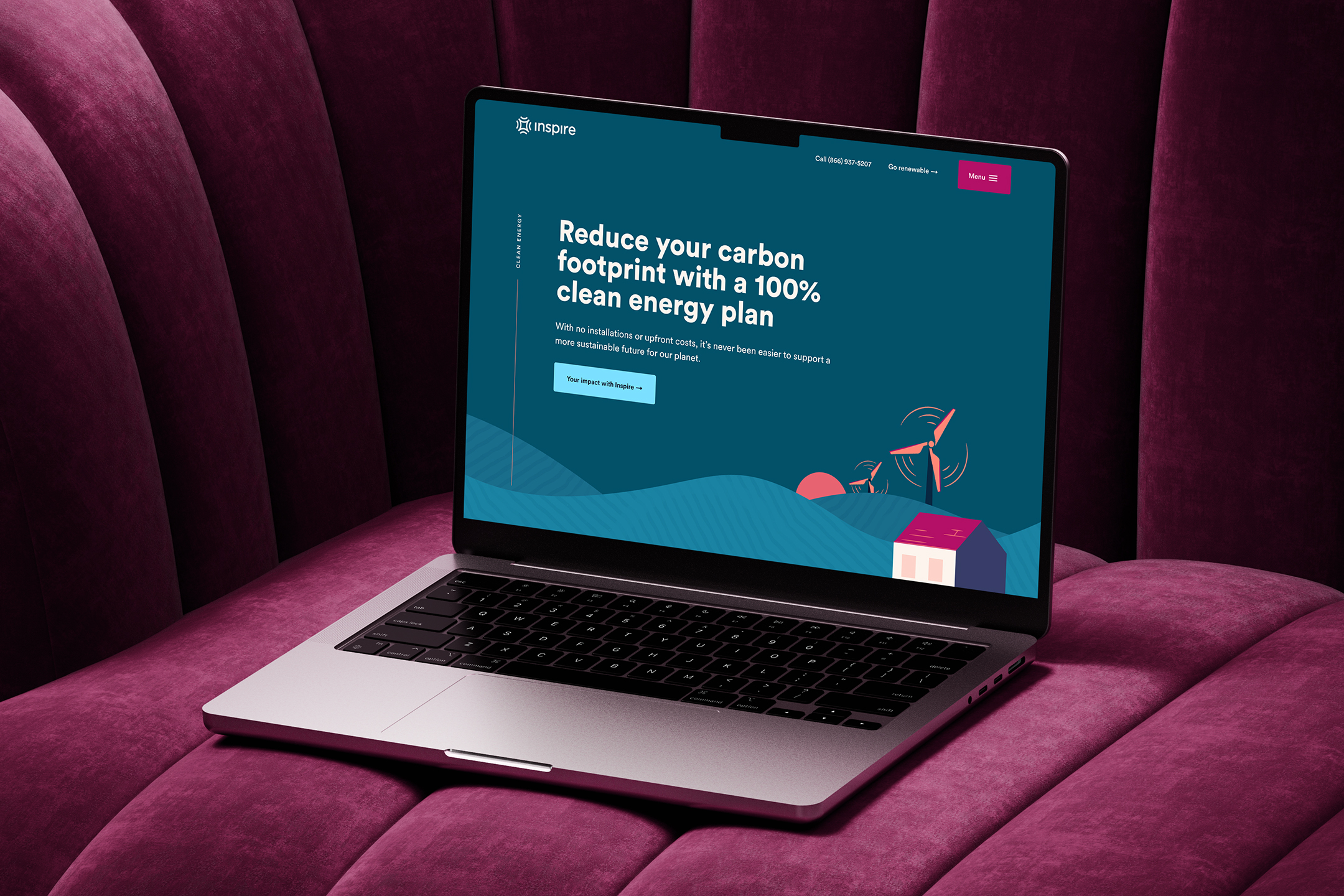Working with a new color palette and design system, we collaborated with Inspire's product team to reimagine the look and feel, content structure, and flow of the site. The approach we landed on leaned heavily into illustrative elements to garner approachability and warmth. We used bold color treatments mixed with striking imagery to create an uplifting and empowering feeling for the user. We paired that with a neighborly tone and voice to communicate the unmatched value and climate contributions of Inspire.